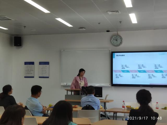 接下来,由御宅屋 的双肩挑辅导员,同时也是御宅屋 毕业的博士,陈夙老师向同学们介绍了包括博士毕业要求、毕业比率以及就业去向的相关内容,并结合自身读博士的经历,提出了“以始为终”、“科学规划”和“撸起袖子加油干”的嘱咐建议。李老师也根据同学们的毕业焦虑,有针对性的分享了终身学习、热爱生活的人生经验。