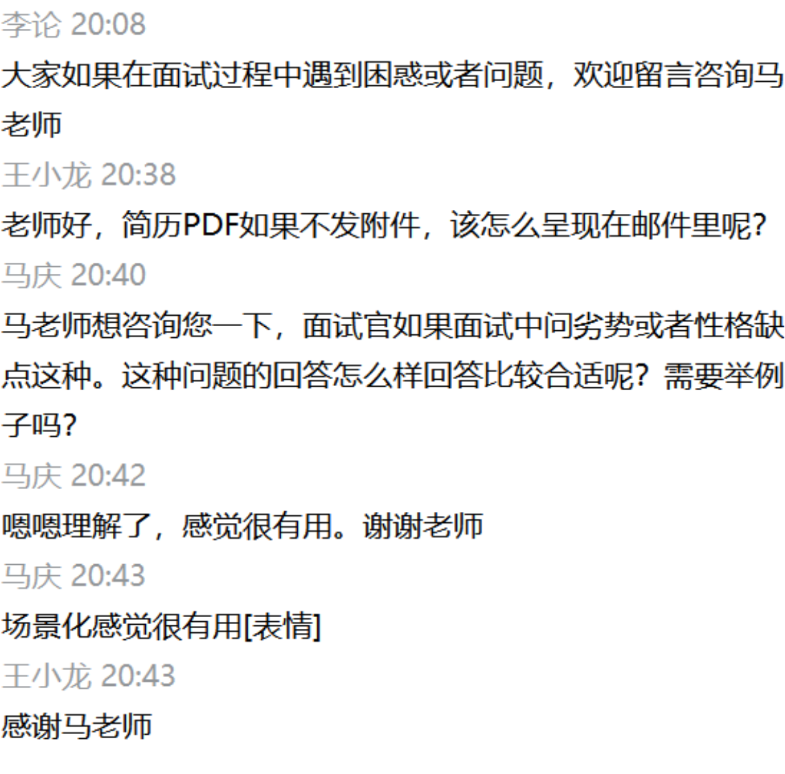 分享会最后的答疑环节,同学们就简历格式转换、面试应答等问题与马燕女士进行了互动,大家纷纷表示,此次活动干货良多,受益匪浅,为以后步入职场的第一步厘清了头绪。分享接近尾声,李论老师对马燕女士的耐心指导表示了衷心的感谢,并表示学院将持续推进职业发展系列活动,为学生的未来发展需求提供更多平台与支持。