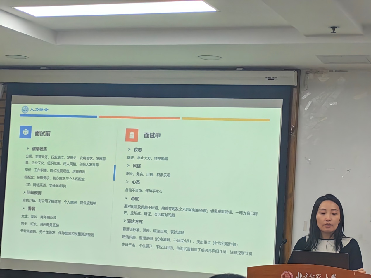 王晓辉还就面试准备和过程中的注意事项提供了实用建议。她建议求职者在准备时要全面了解企业信息和应聘岗位,以及个人与岗位的匹配度。在面试过程中这一环节,她强调了自我介绍的重要性、适当的着装、保持良好的仪态与心态,以及如何应对压力面试和陷阱问题。此外,她还强调了面试准备的重要性,表明这是对机遇和企业的尊重。