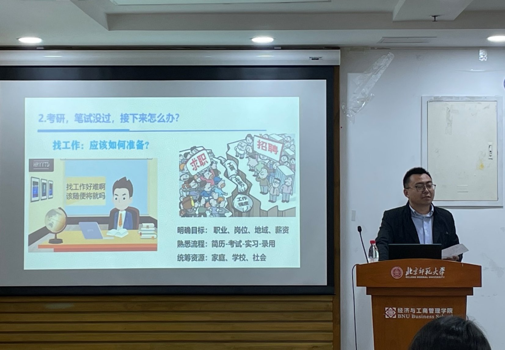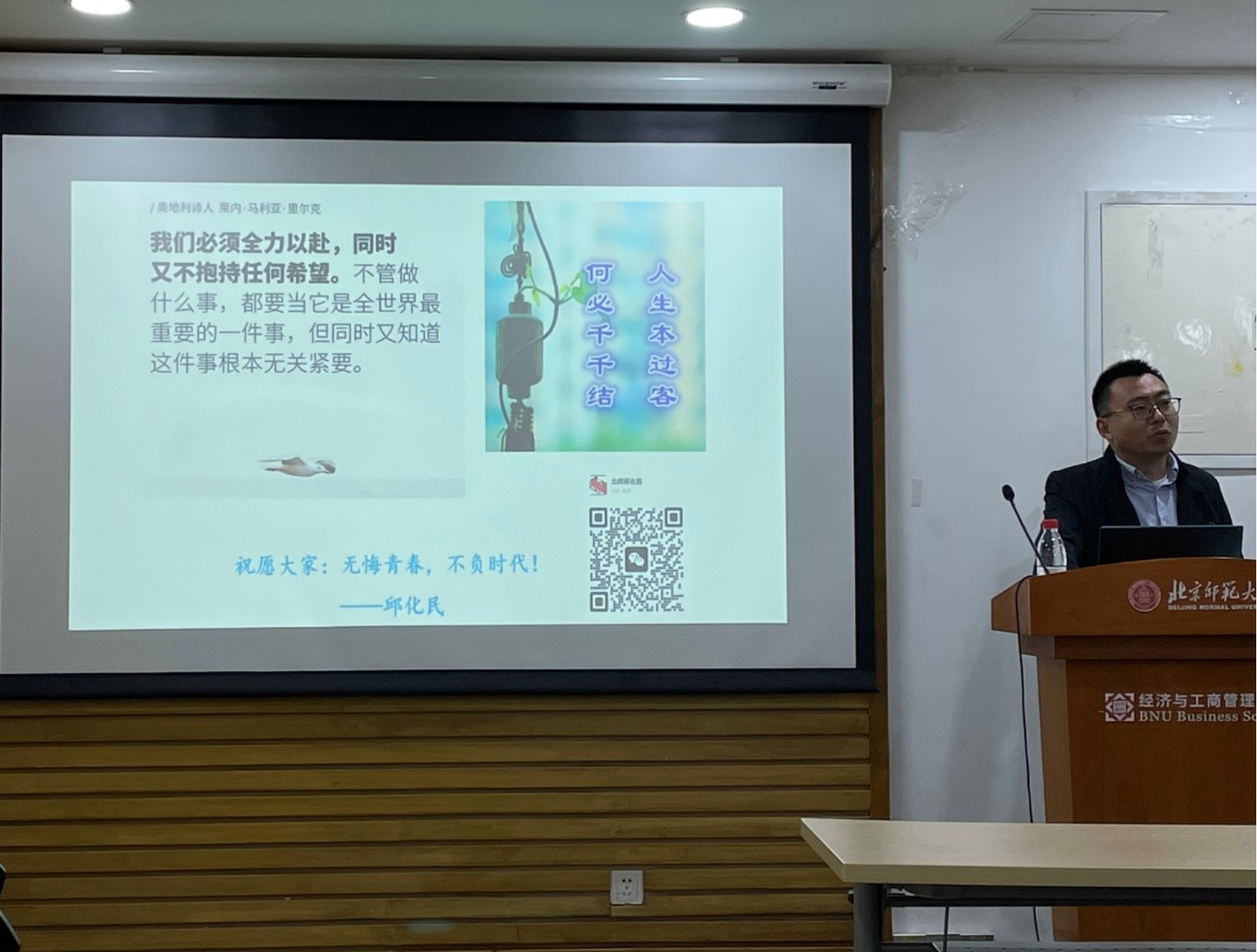然后,他分别从二战考研、找工作、出国留学、创业、自由职业、待业等选择上提出了同学们需要注意的问题。他指出,二战考研的不确定性因素有很多,同学们不仅要面对考试,还要克服生活、心理等方面的问题;如果选择就业,同学们需要明确目标、熟悉流程、统筹资源;如果选择出国留学,需要考虑投入产出的性价比;如果选择创业或自由职业,则需要充分利用可获得的资源,同时考虑自身的性格特点;如果选择待业,他提醒同学们注意考虑应届生身份以及档案和户口的迁移问题。邱老师强调,在人生之路上,我们必须全力以赴,同时又不抱任何希望。不管做什么事,都要当它是全世界最重要的一件事,但同时又知道这件事根本无关紧要。
