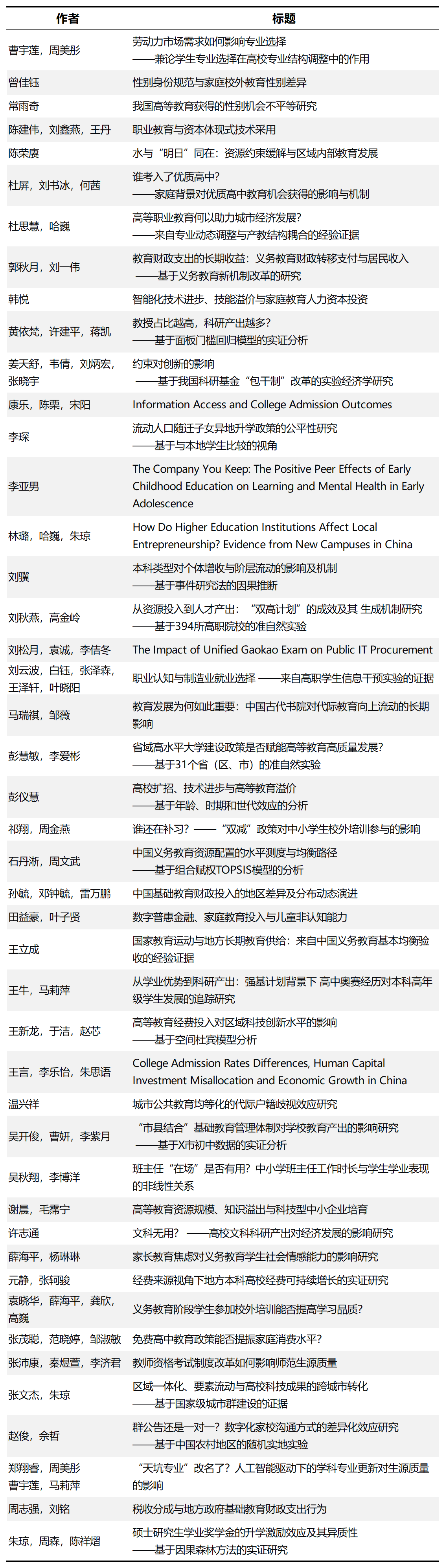 首届全国教育经济学青年学者论坛(2025)共收到投稿论文165篇,论坛组委会组成了来自各发起单位的专家评审委员会,对论文进行了评审,共选出45篇优秀论文进行会议报告,名单如下(按音序排序):