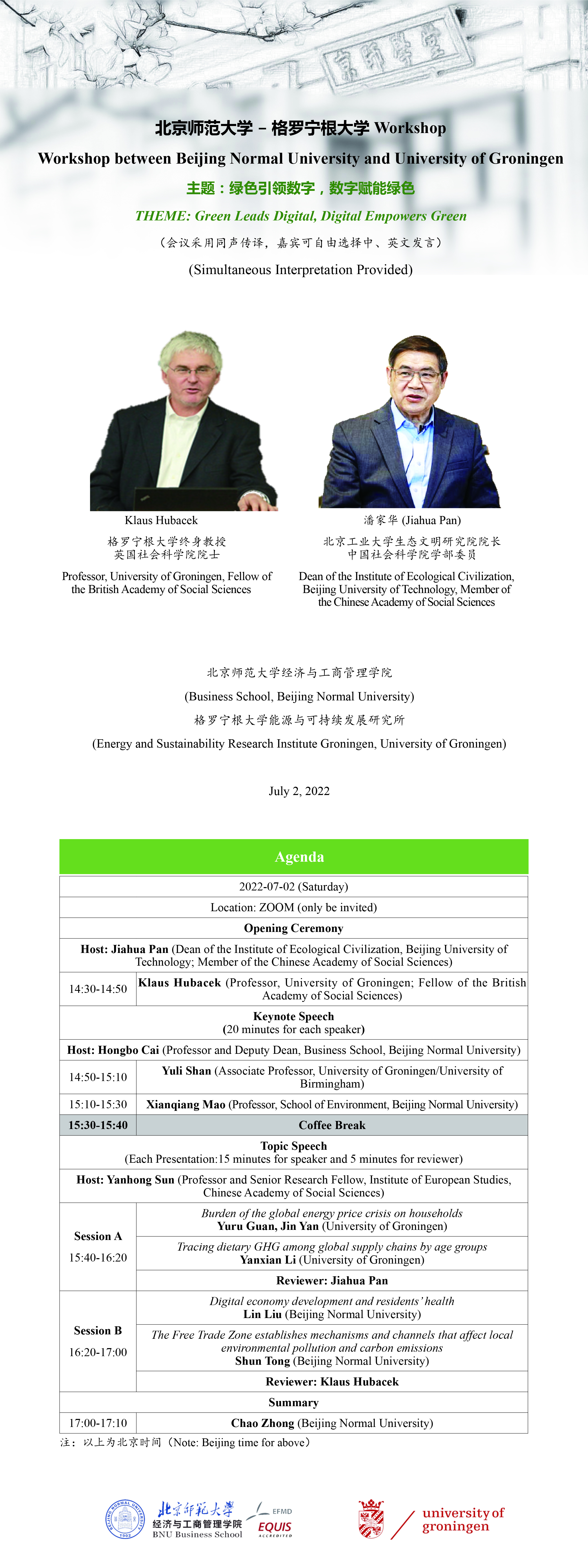 - 2022-06-22 北师大-格罗宁根大学“绿色引领数字,数字赋能绿色”国际workshop