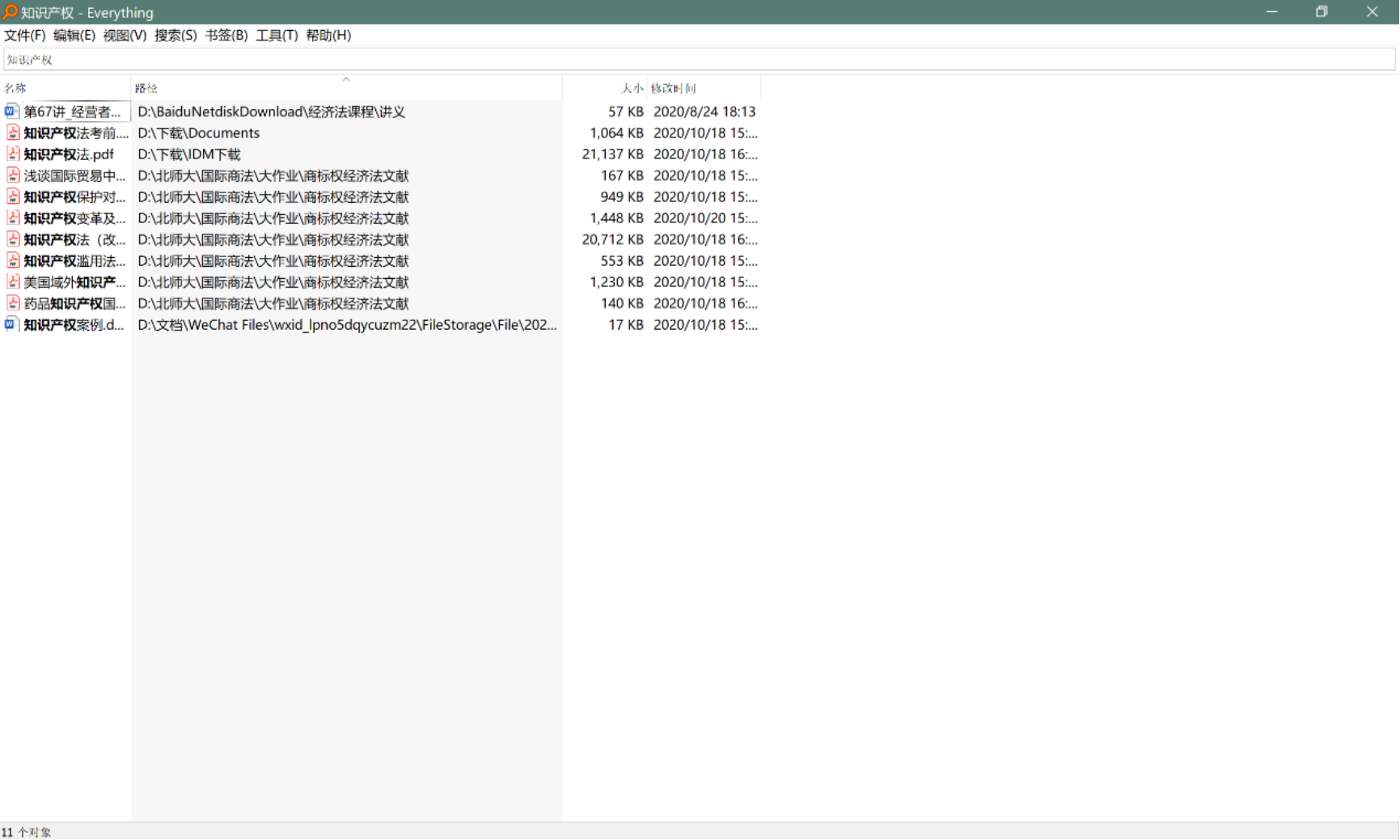 这款软件可以通过访问NTFS文件系统的USN日志,在几秒内检索完5000G大小的硬盘里数百万个文件。比如,我的国际商法的知识产权的案例资料找不到了,只需要不到1秒的时间,Everything就能找到电脑里所有带知识产权字样的文件。