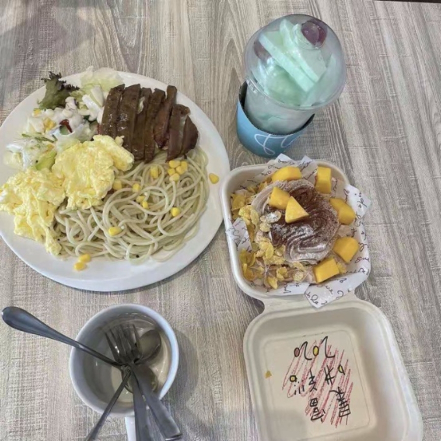 这是我和孟琪同学一起探索的第二家甜品店,位置在粤华苑13栋1楼,位置虽然有点远,但是也阻挡不了吃货的内心。这家店的盒子蛋糕超级好吃,奶油甜而不腻,意面味道也很不错,薄荷味的炒酸奶也超级独特,推荐啦~